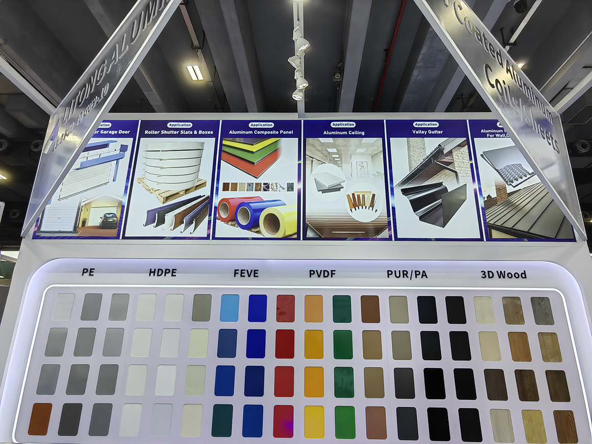 本次广交会上,力同铝业集中展示了旗下核心彩涂铝卷系列产品,包括PE、HDPE、FEVE、PVDF、PUR/PA等类别,用途涵盖屋面系统、天花吊顶、建筑幕墙及卷帘门窗等应用领域,全方位呈现企业在铝卷彩涂领域的深厚积淀。
