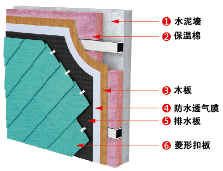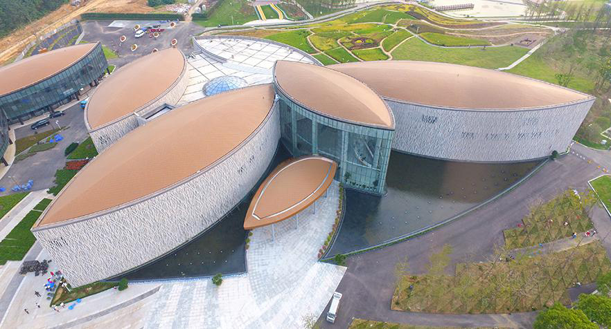隆平博物馆的屋面系统采用菱形平锁扣系统,屋面由多张400*400mm的菱形屋面板组合而成。菱形平锁扣系统与传统的系统不同,菱形平锁扣板板的正面有凸边缘,背面则有凹边缘,可以形成板块接口;菱形平锁扣板面积小,能灵活适用于各种设计方案,并可构造出复杂的几何造型的外墙面,如可以在不破坏整体设计的情况下,封盖屋顶窗、烟囱或屋顶缘。