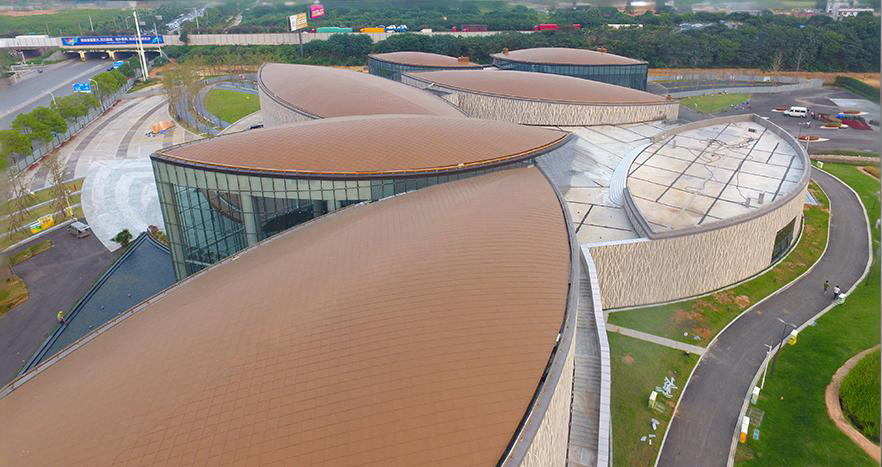 隆平博物馆的屋面系统采用菱形平锁扣系统,屋面由多张400*400mm的菱形屋面板组合而成。菱形平锁扣系统与传统的系统不同,菱形平锁扣板板的正面有凸边缘,背面则有凹边缘,可以形成板块接口;菱形平锁扣板面积小,能灵活适用于各种设计方案,并可构造出复杂的几何造型的外墙面,如可以在不破坏整体设计的情况下,封盖屋顶窗、烟囱或屋顶缘。